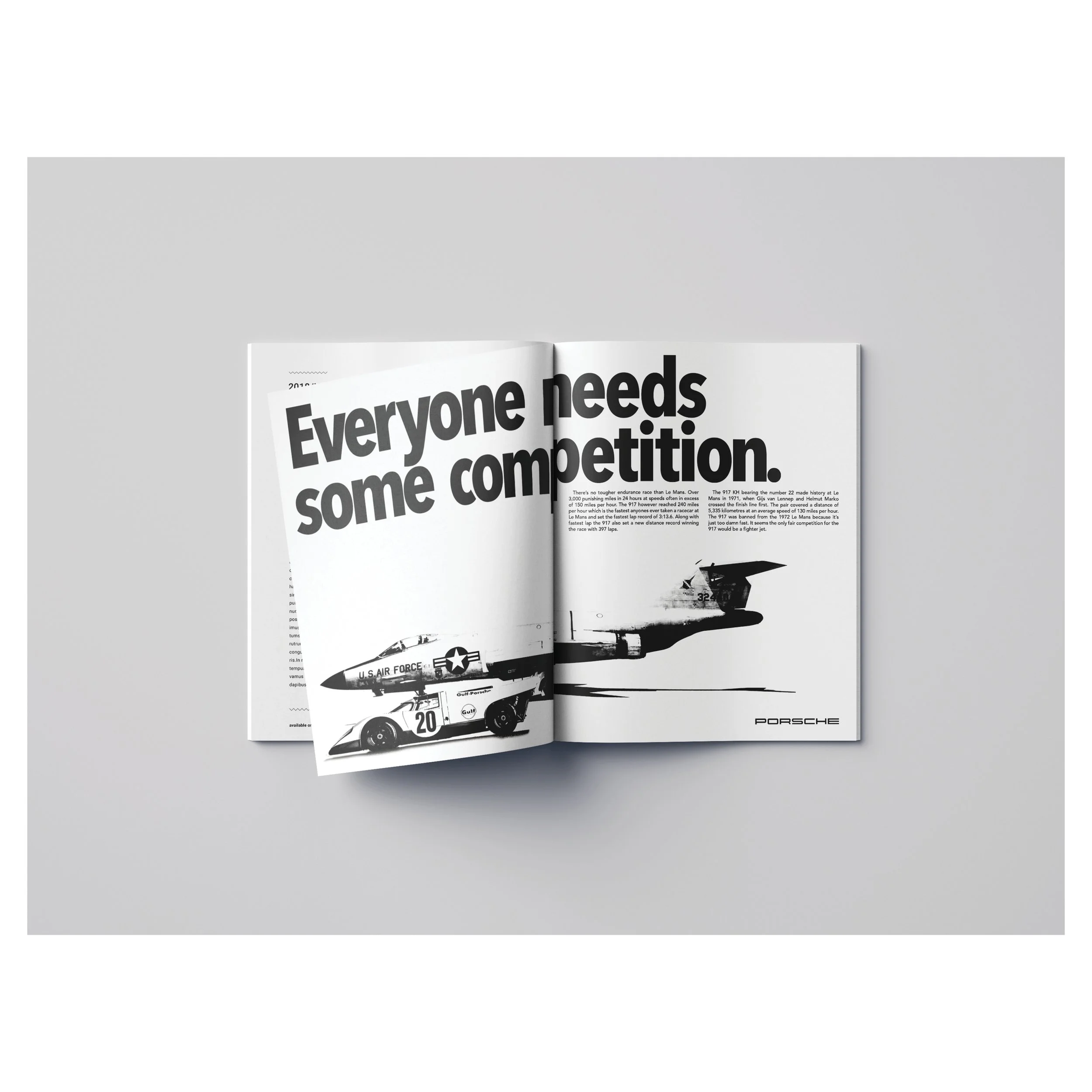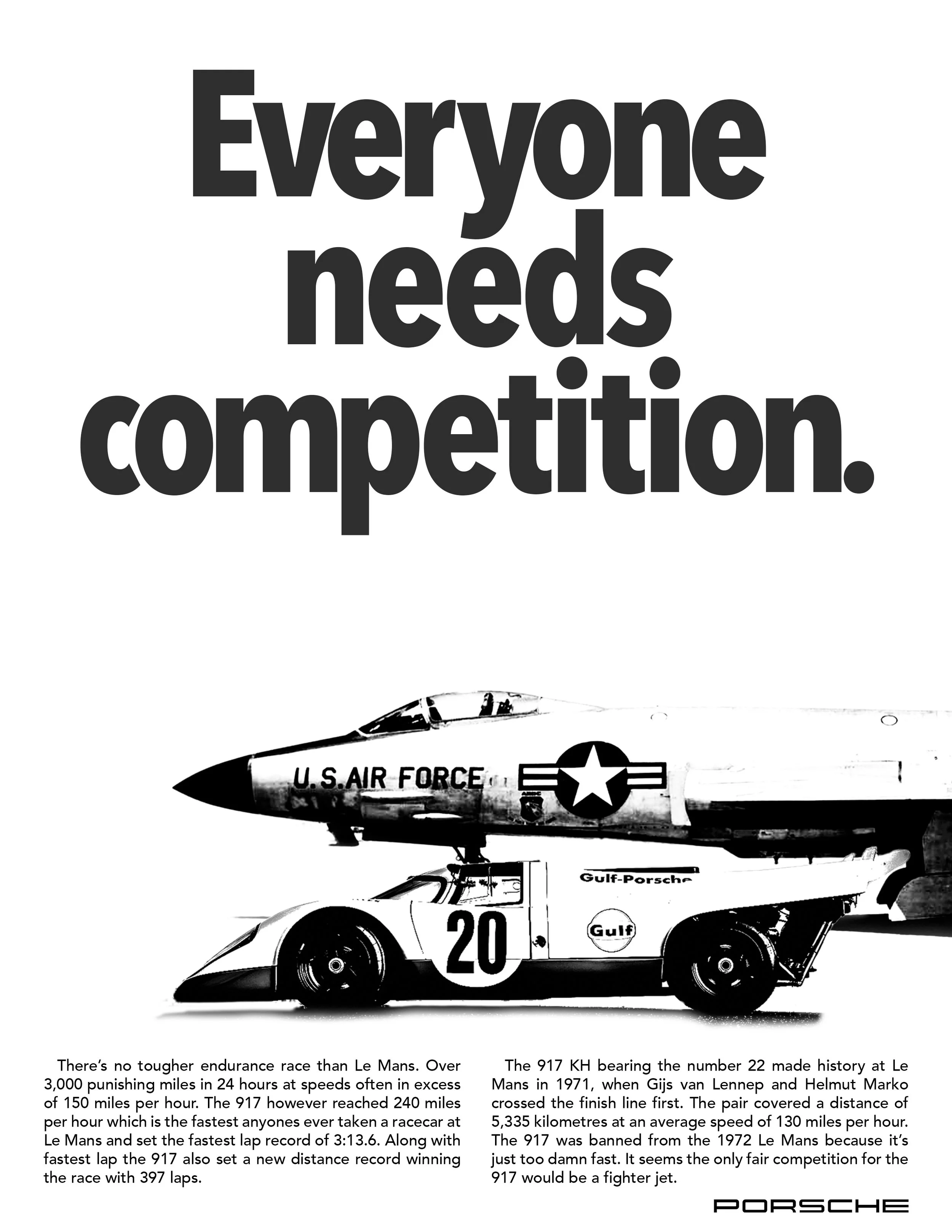 Emulate the style of vintage Porsche ads like their “Nobody’s Perfect” and “Porsche separates Le Mans from Le Boys” Ads from the 80s. I wanted to showcase the Porsche 917 as a Race-car way ahead of its time breaking many records at the 1971 Le Mans that took over 40 years to even match. I tried to show that by using the funny/sassy copy that Porsche is known for all while keeping it with the same aesthetic as their old ads.